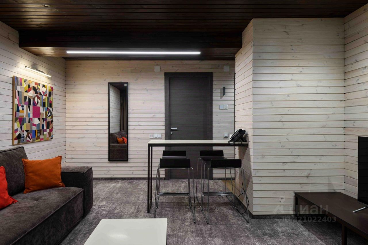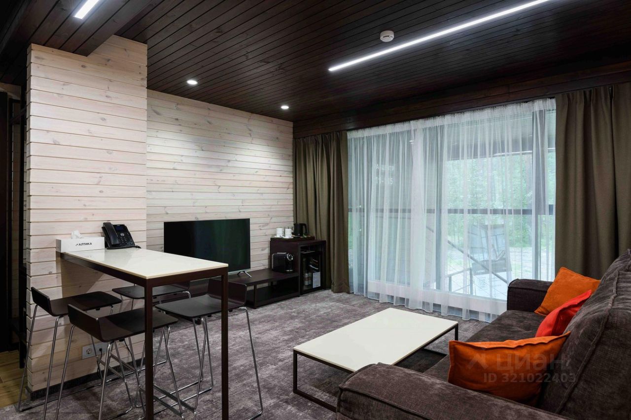 Номер расположен в основном корпусе эко-отеля на первом этаже. Одна из стен номера имеет панорамное остекление. Номер состоит из гостиной и спальни. Гостиная: диван, журнальный столик, TV, телефон, барная стойка, барные стулья, кофе-машина, электрический чайник, стаканы, чайный сервиз, нож, штопор, мини-бар. Спальня: двуспальная кровать, прикроватные тумбочки, вешалка для одежды, халаты, сейф, зеркало, бра. Санузел с душевой кабиной: электрический полотенцесушитель, набор полотенец, индивидуальный гигиенический набор (мыло, шампунь, гель для душа, шапочка для душа, зубная щетка, зубная паста), фен, тапочки. Вместимость: 4 основных места (двуспальная кровать и диван) Пл. номера: 41 кв.м.