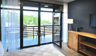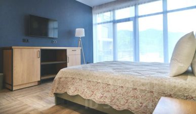 Комфортный двухместный номер с возможностью дополнительного размещения на втором этаже нового корпуса с панорамным окном и видом на горы и озеро.