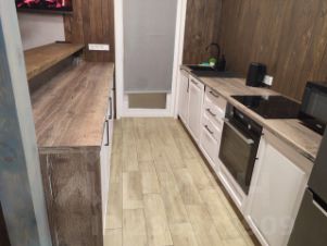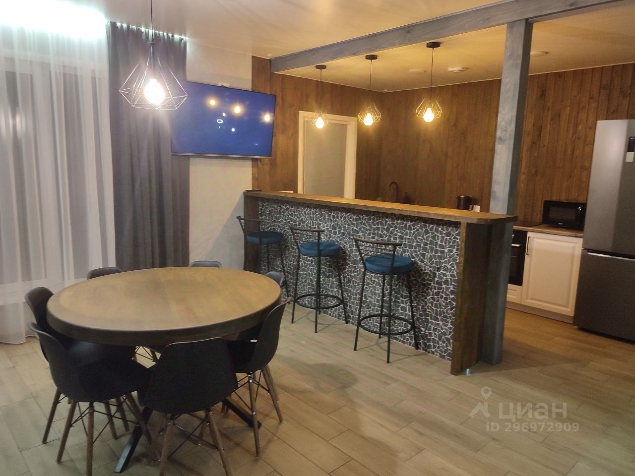 кухонная и обеденная зона, которые включают в себя барную стойку с тремя барными стульями, холодильник, электрическую плиту, вытяжку, духовой шкаф, посудомоечную машину, чайник, посуду и кухонные принадлежности, микроволновую печь, стол и 6 стульев;