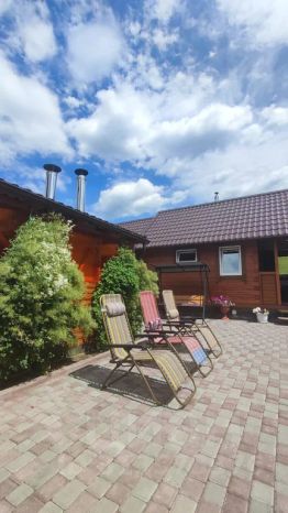 В доме двухспальная кровать и диван-книжка, телевизор, своя кухонная зона, холодильник, микроволновка, чайник, плита, вся необходимая посуда. Внутри санузел, душевая кабина.