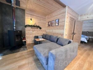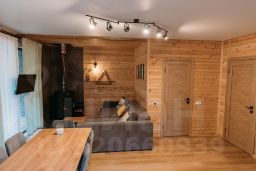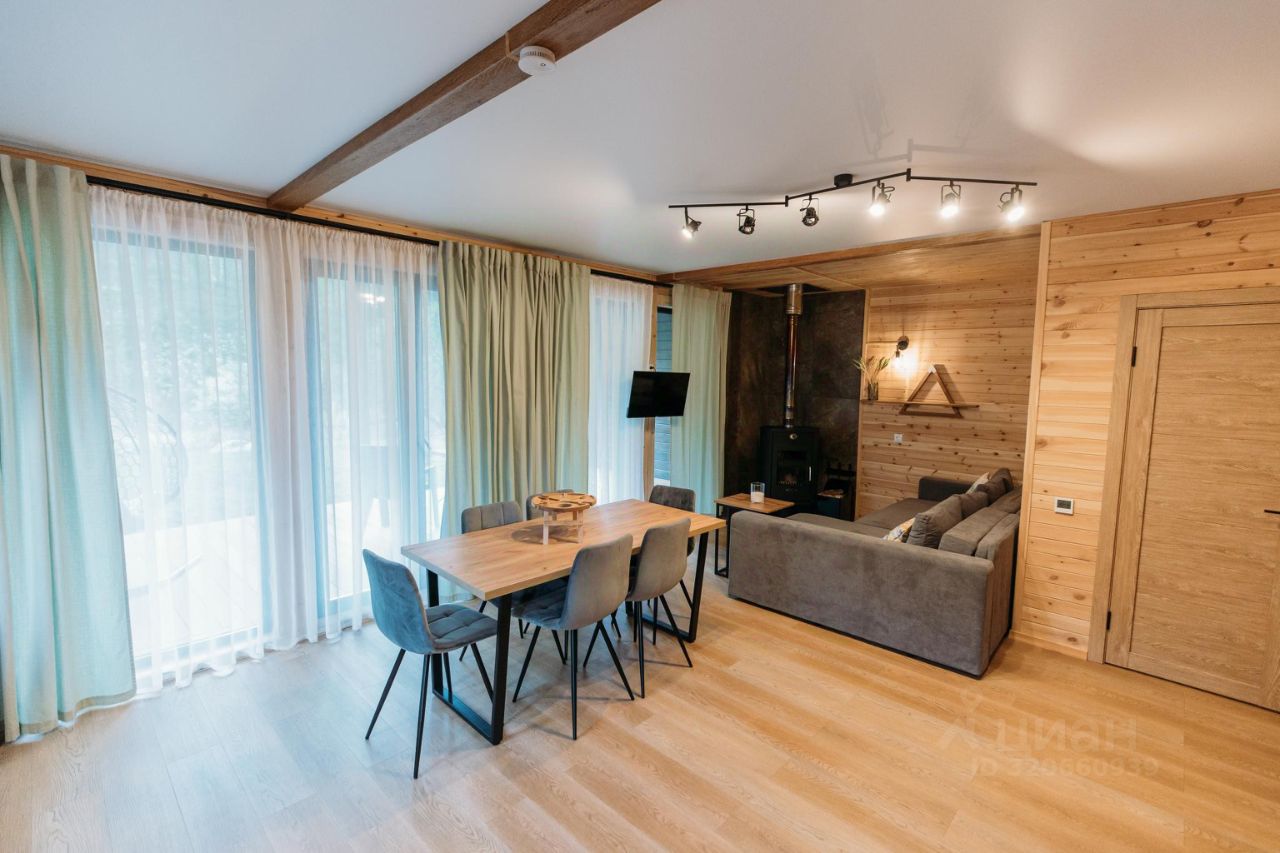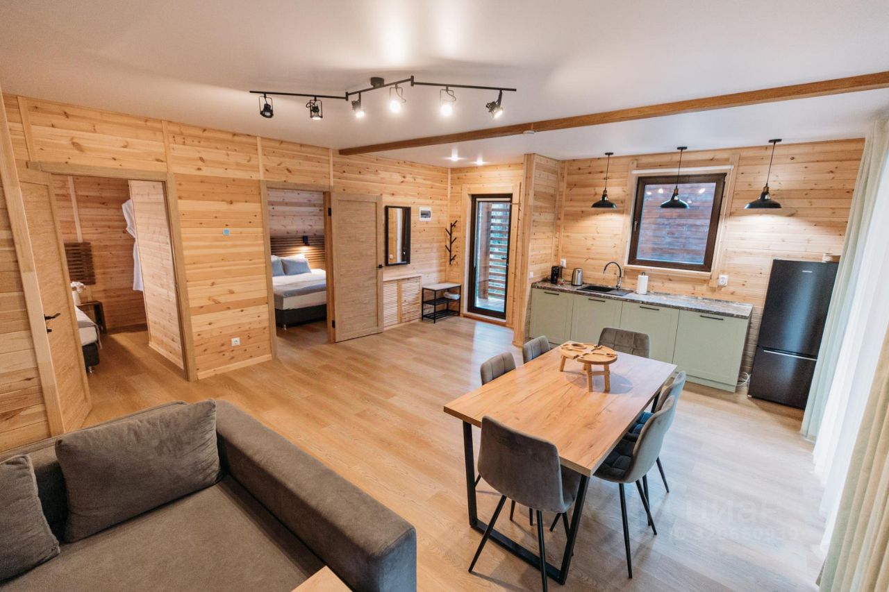 Просторный дом 80 м2 с двумя спальнями и общим залом площадью 32 кв.м. на берегу реки с панорамными окнами и видом на горы.