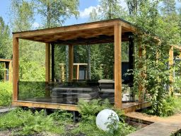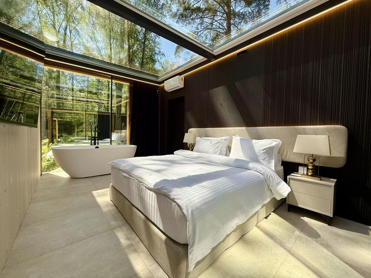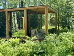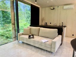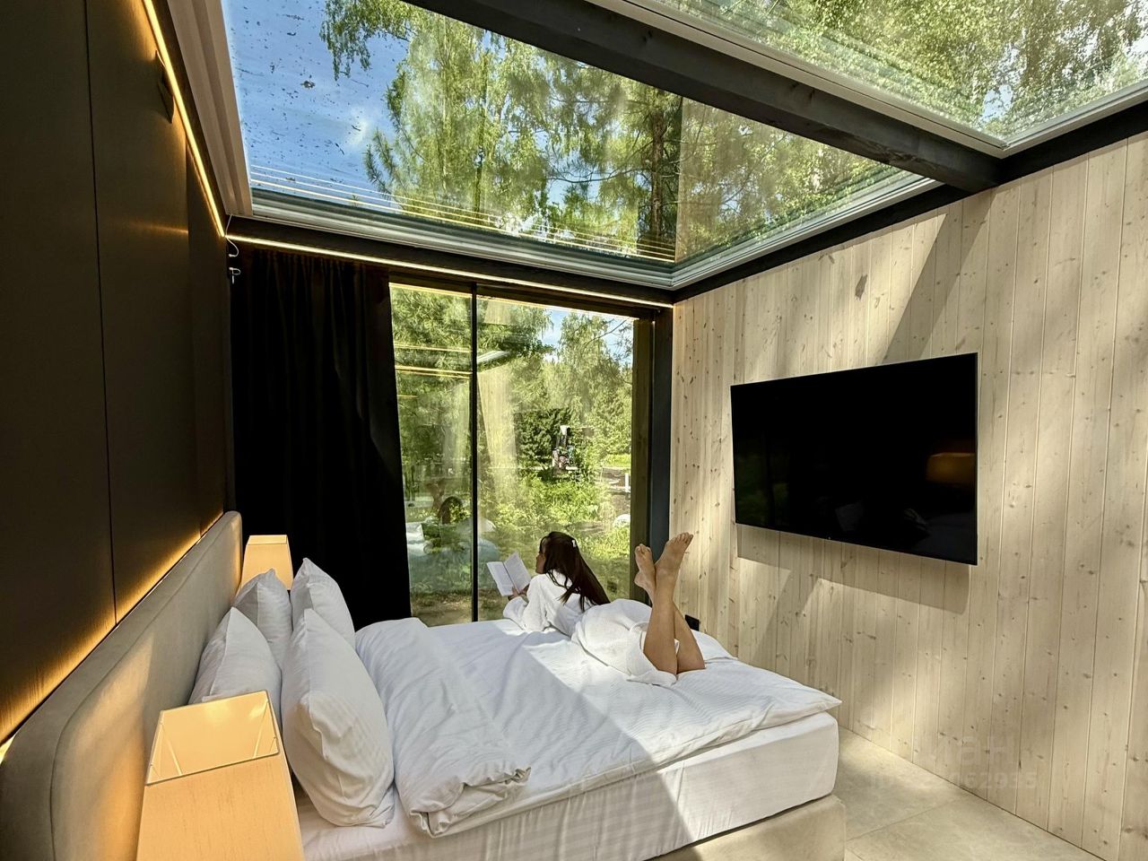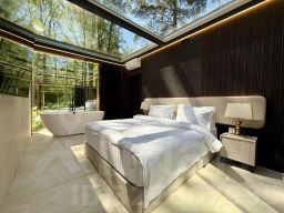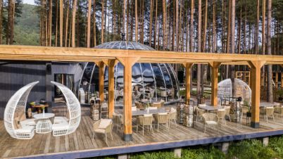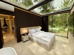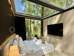 Дом с панорамным потолком и стенами погружает вас в атмосферу природы, не выходя из уюта. Идеален для романтического уикенда или отдыха семьей — с камином и проектор, ванной у панорамного окна с видом на лес. Терраса с дизайнерской мебелью и собственная кухонная зона с барной стойкой делают этот дом по-настоящему особенным.