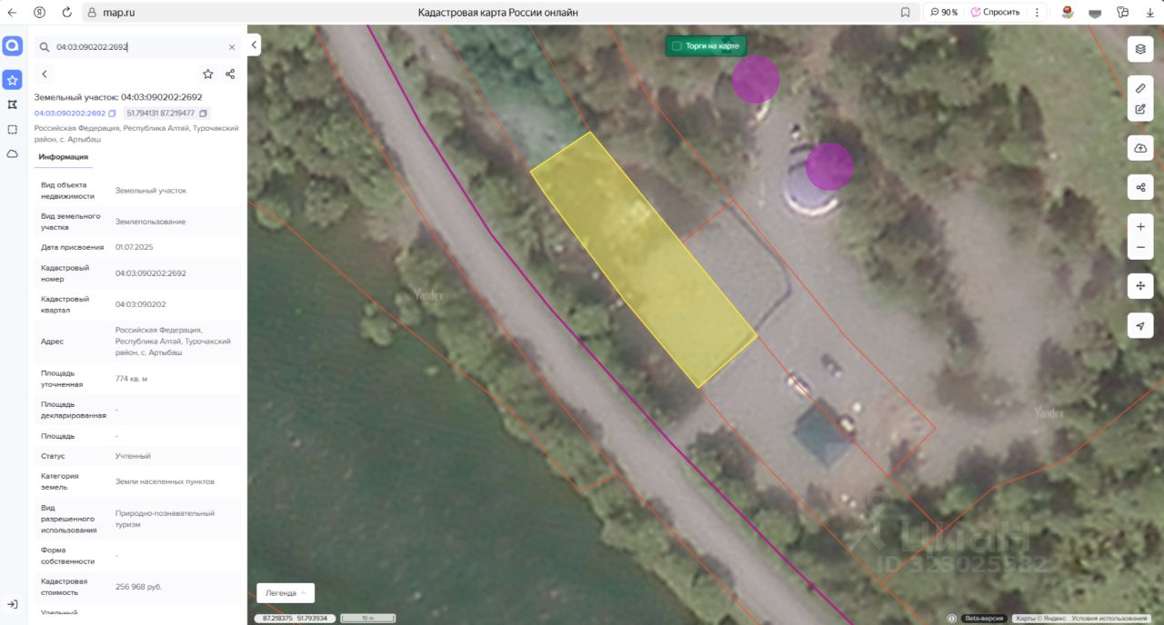 Земельный участок с кадастровым номером 04:03:090202:2692 площадь 774 по адресу Российская Федерация, Республика Алтай, Турочакский район, с. Артыбаш