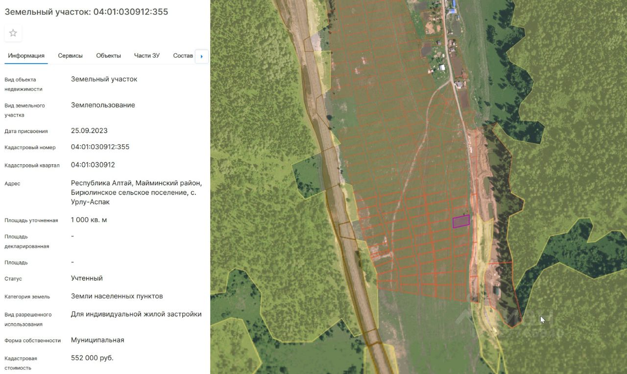 Земельный участок с кадастровым номером 04:01:030912:355, местоположение: Российская Федерация, Республика Алтай, Майминский район, Бирюлинское сельское поселение, с. Урлу-Аспак. Площадью участка 1000 кв.
