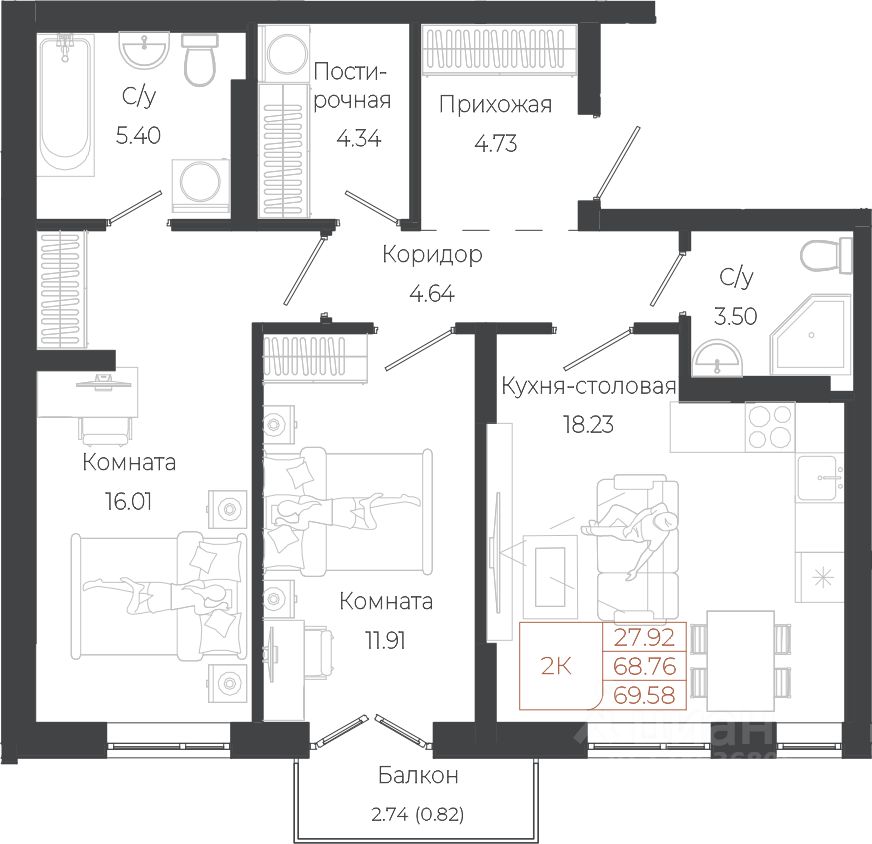 Общая площадь69,58 м²