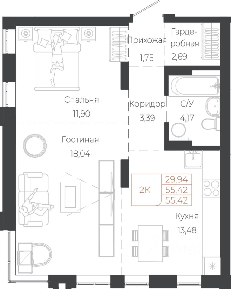 55,42 м²