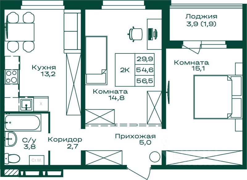 56,5 м²