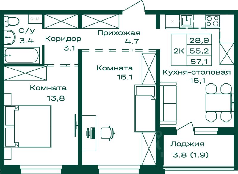 Общая площадь57,1 м²
