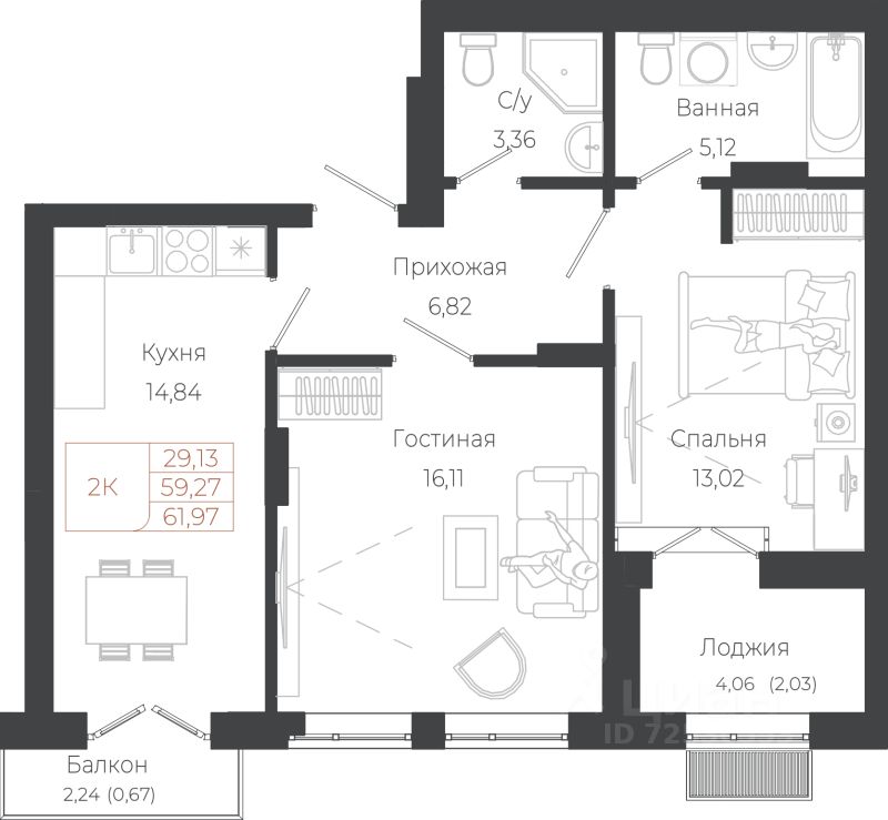 Продаётся 2-комнатная квартира в строящемся доме (Корпус 5), срок сдачи: III-кв. 2029, общей площадью 61.97 кв.м., на 2 этаже. Новый жилой комплекс расположен по адресу: с. Майма, по ул. Энергетиков.