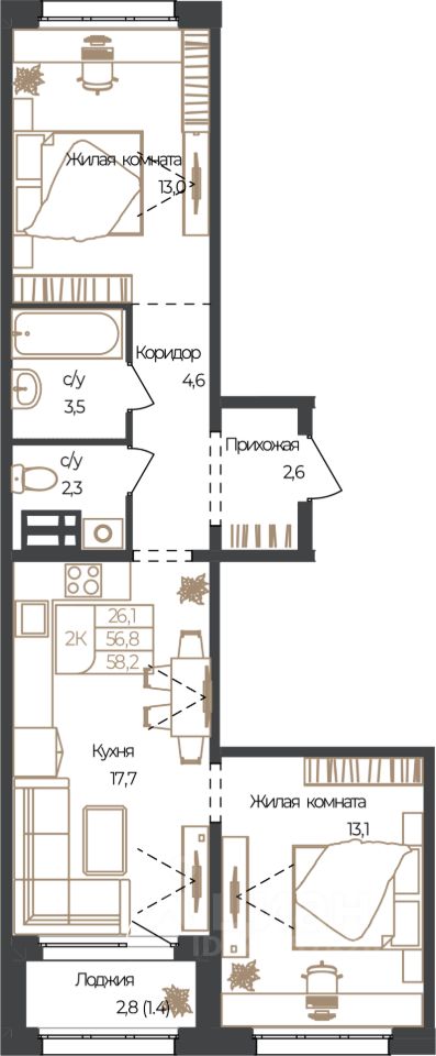 Продаётся 2-комнатная квартира в строящемся доме (Корпус 2), срок сдачи: IV-кв. 2027, общей площадью 58.2 кв.м., на 6 этаже. Новый жилой комплекс "Чуйские кварталы" от группы компаний "УК СЕЛФСТРОИТ" расположен по адресу: с. Майма, по ул. М. Глухарёва.
