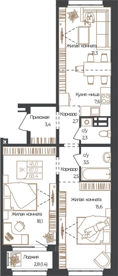 Продаётся 3-комнатная квартира в строящемся доме (Корпус 1), срок сдачи: IV-кв. 2027, общей площадью 68.4 кв.м., на 2 этаже. Новый жилой комплекс "Чуйские кварталы" от группы компаний "УК СЕЛФСТРОИТ" расположен по адресу: с. Майма, по ул. М. Глухарёва.