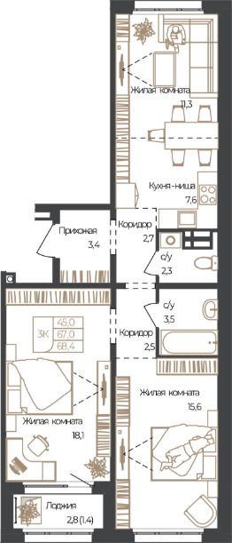 Продаётся 3-комнатная квартира в строящемся доме (Корпус 1), срок сдачи: IV-кв. 2027, общей площадью 68.4 кв.м., на 6 этаже. Новый жилой комплекс "Чуйские кварталы" от группы компаний "УК СЕЛФСТРОИТ" расположен по адресу: с. Майма, по ул. М. Глухарёва.