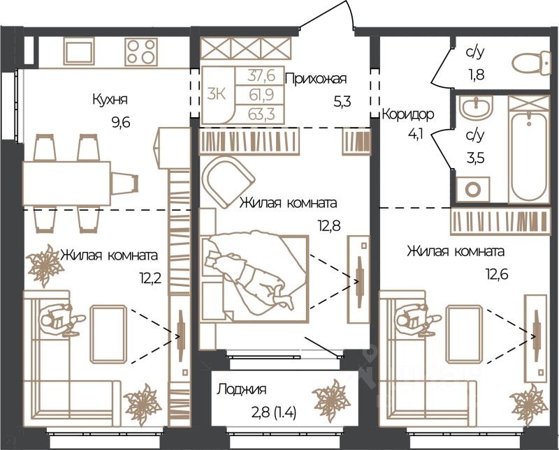 Продаётся 3-комнатная квартира в строящемся доме (Корпус 1), срок сдачи: IV-кв. 2027, общей площадью 63.3 кв.м., на 7 этаже. Новый жилой комплекс "Чуйские кварталы" от группы компаний "УК СЕЛФСТРОИТ" расположен по адресу: с. Майма, по ул. М. Глухарёва.