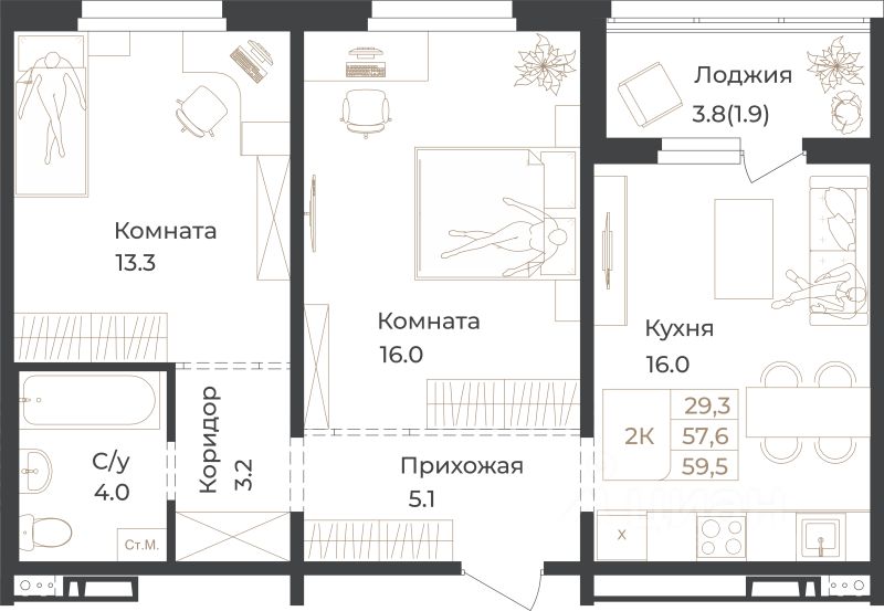 59,5 м²