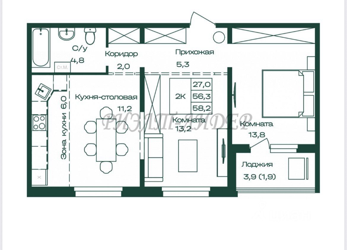 Квартира общей площадью 54,5 кв.м включает большую кухню-гостиную, удобную планировку комнат и застекленную лоджию. Квартира на 6 этаже.