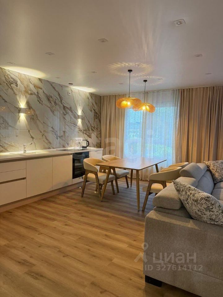 Планировка включает просторную кухню-гостиную и мастер спальню с собственным санузлом, дополнительный санузел в гостиной, отдельная гардеробная. Широкий коридор.