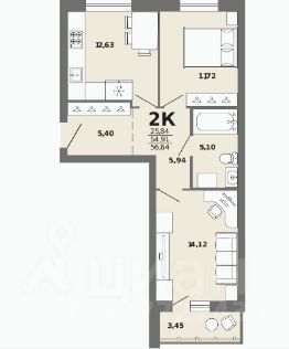 Продается 2-комн. квартира, 56,64 м²
