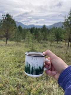 Примерно 60% участка покрыта молодыми ёлочками, остальная часть — грибные полянки с панорамным видом на горные вершины.