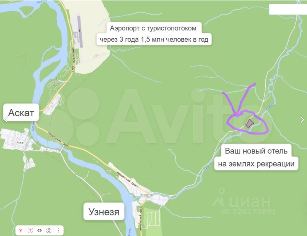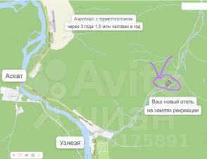 Участок (04:05:030401:1064) реальной площадью ~1,8 Га (по документам 1,3 Га) с действующим прибыльным купольным отелем в долине реки Узнезя в 3 км от села по асфальтированной дороге. Продажа в связи с расширением смежного направления в Горном Алтае.