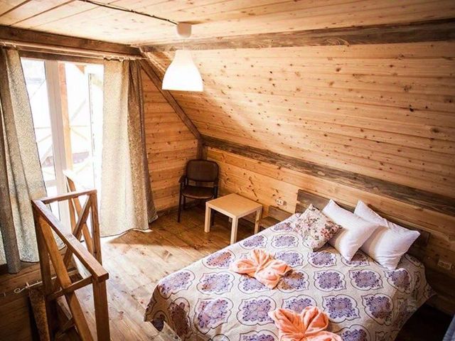 Трёхкомнатный номер на втором этаже частного дома с отдельным входом с улицы, кухней и большой террасой с видом на горы. Сдается как полностью этаж для одной семьи, так и по номерам отдельно. Интерьер номера: все номера отделаны натуральным деревом, в номерах двуспальная кровать (кровать раздвигается), постельное бельё + полотенце, прикроватные тумбочки, комод, кресло кровать, телевизор и раскладной диван (доп. Место), wi-fi. Санузел: холодная, горячая вода, душевая кабина, унитаз, раковина с тумбой, стиральная машина-автомат, зеркало, фен, жидкое мыло, шампунь, гель для душа. Кухня полностью оборудованная всем необходимым для приготовления пищи и ее хранения, телевизор.