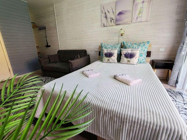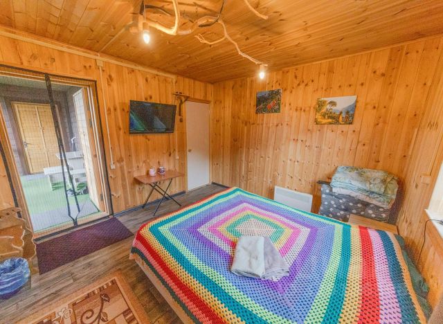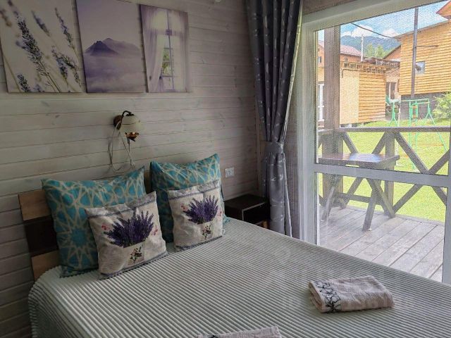 Трёхкомнатный номер на втором этаже частного дома с отдельным входом с улицы, кухней и большой террасой с видом на горы. Сдается как полностью этаж для одной семьи, так и по номерам отдельно. Интерьер номера: все номера отделаны натуральным деревом, в номерах двуспальная кровать (кровать раздвигается), постельное бельё + полотенце, прикроватные тумбочки, комод, кресло кровать, телевизор и раскладной диван (доп. Место), wi-fi. Санузел: холодная, горячая вода, душевая кабина, унитаз, раковина с тумбой, стиральная машина-автомат, зеркало, фен, жидкое мыло, шампунь, гель для душа. Кухня полностью оборудованная всем необходимым для приготовления пищи и ее хранения, телевизор.