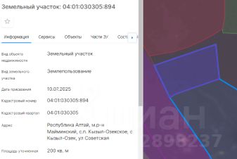 Земельный участок местоположение Российская Федерация, Республика Алтай, Майминский район, Кызыл-Озекское сельское поселение, с. Кызыл-Озек, ул. Советская. Площадь участка 200 кв.м, кадастровый номер 04:01:030305:894, права на з...